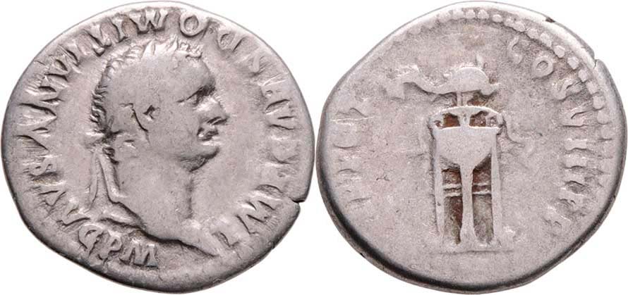AR Denár, Rv:"TR.POT.COS.VIII.P.P.", obřad. trojnožka a delfín, S.neuvádí, RIC.27 - mincovna Řím - ražba z roku 82, nedor., patina