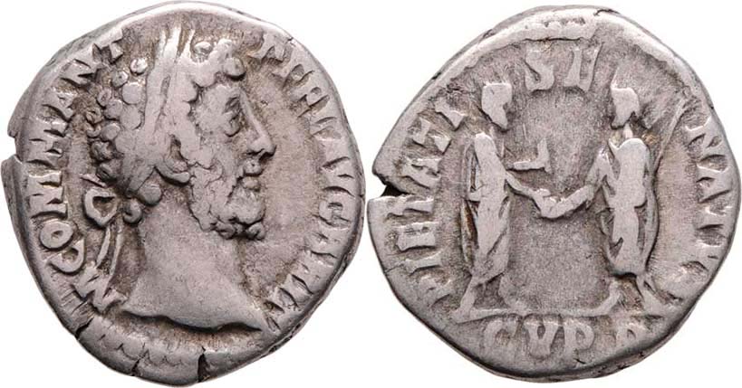 AR Denár, Rv:"PIETATI.SENATVS.C.V.P.P.", stojící císař a senátor, S.neuvádí, RIC.194 - mincovna Řím - ražba z let 186 - 189, nepravidel. okraj, patina R!
