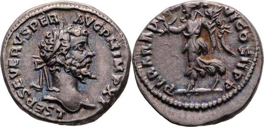 AR Denár, Rv:"PAR.AR.AD.TR.P.VI.COS.II.P.P.", Victoria kráčející doleva, S.neuv., RIC.496a - minc. Řím - ražba z roku 198, mírně exc., pěkná patina R!