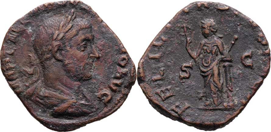 AE Sestercius, Rv:"FELICITAS.PVBLICA.S.C.", stojící Felicitas, S.2738, RIC.251a - mincovna Řím - blíže nedatován, nepravidelný tvar střížku, pěkná patina R!