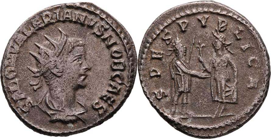 Bil.antoninianus, Rv:"SPES.PVBLICA.", Spes předává květinu Saloninovi, podobný jako S.2982A, RIC.13 - mincovna Řím - ražba z roku 258, pěkná patina, téměř
