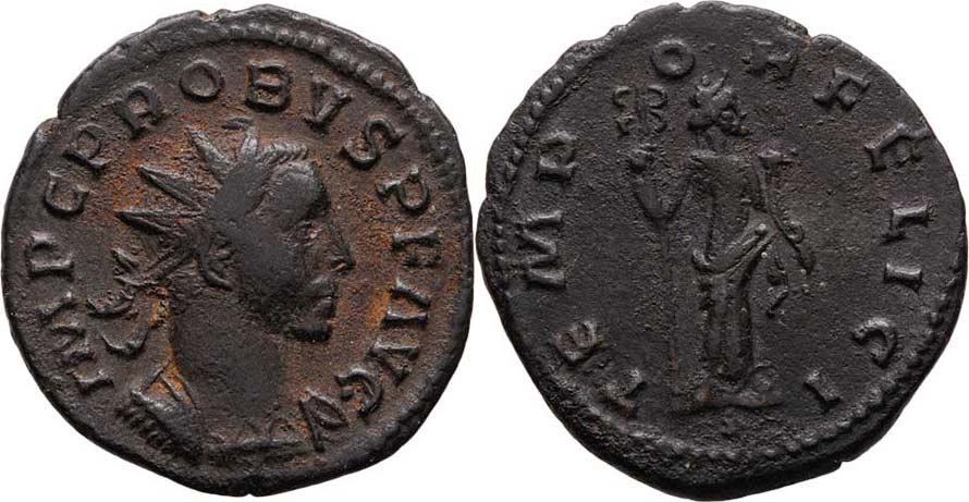 AE Antoninianus, Rv:"TEMPOR.FELICI." stojící Felicitas, podobný jako S.3273, RIC.104 - mincovna Lugdunum, pěkná patina