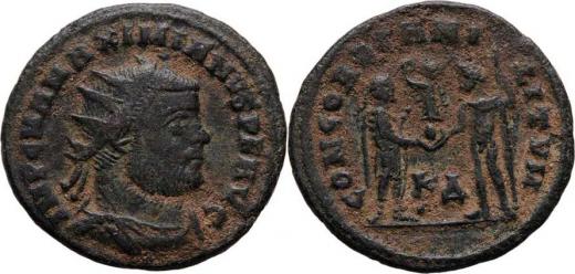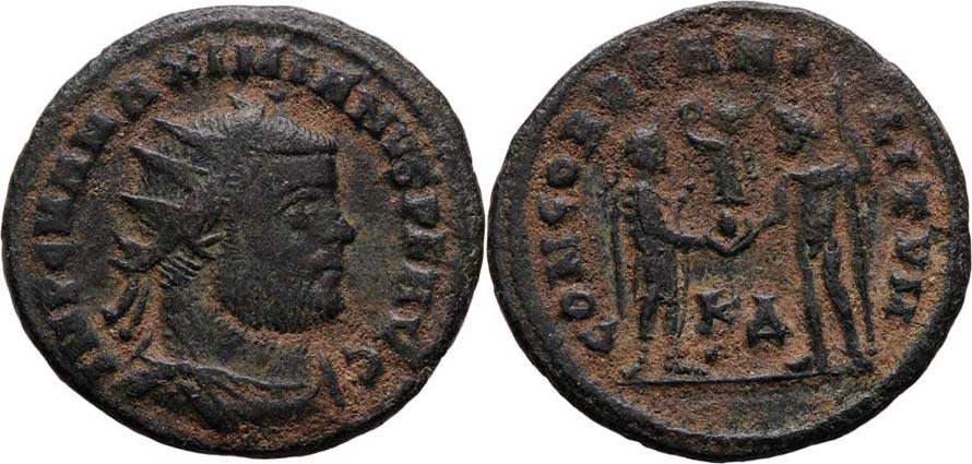 AE Antoninianus, Rv:"CONCORDIA.MILITVM.", RIC.6.16b, S.3511 - Cyzicus - 4.dílna - ražba z let 295 - 299, pěkná patina