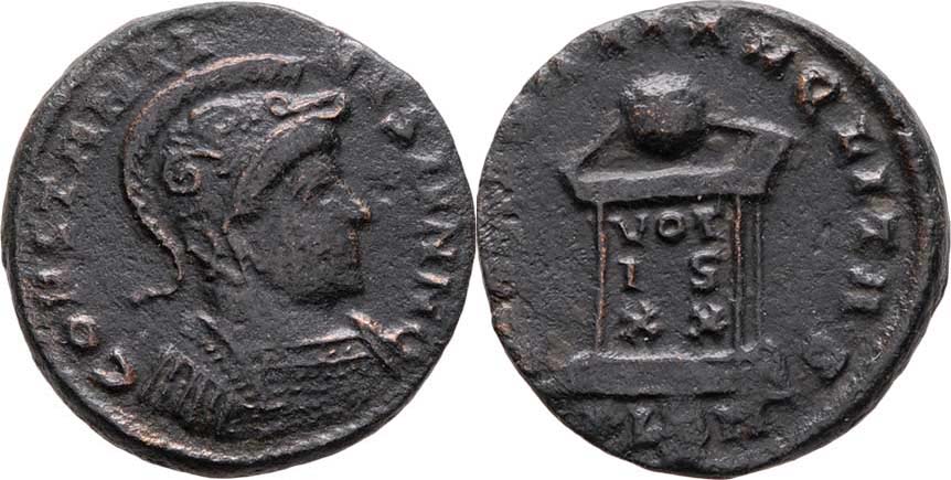 AE3, Rv:"BEATA.TRANQUILLITAS.VOTIS.XX.", RIC.286, S.3842 - Londinium - ražba z let 323 - 324, patina