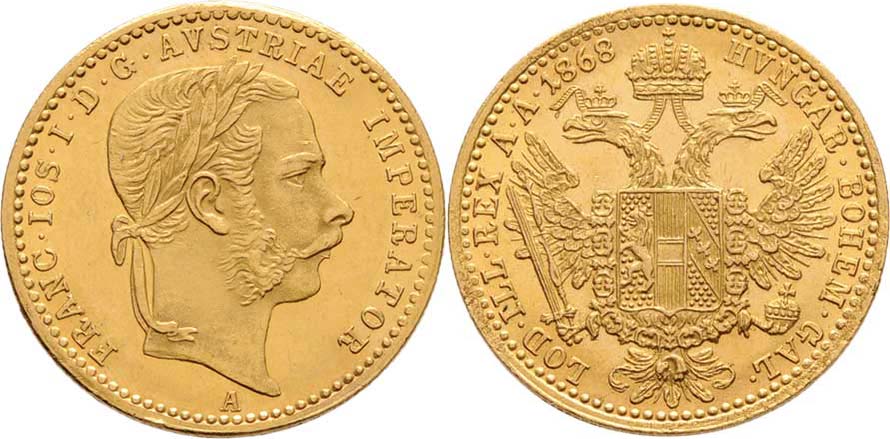 Dukát 1868 A, 3.489g, nep.hr., nep.rysky, téměř R!