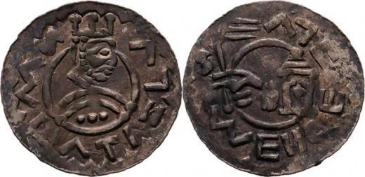 Denár, Ca.354, F.IX/10 (916) - úzká koruna - tři kuličky v rameni panovníka, 0.514g, pěkná patina