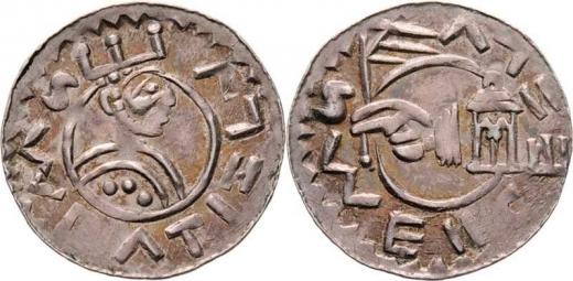 Denár, Ca.354a, F.IX/10 (917) - široká koruna, tři kuličky v rameni panovníka, 0.706g, nep.nedor., pěkná patina