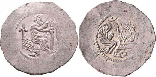 Denár, Ca.623, F.XVIII/13 (1718) - v reversu "Boží oko" nad postavami, 0.681g, opisy nevyraženy, tém. R!
