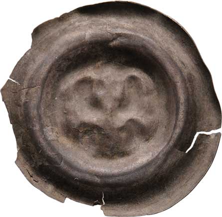Brakteát český, Ca.857, F.XXII/1 (2217 nebo 2320), 0.683g, několikrát naprasklý, mírně olámaný okraj, pěkná patina