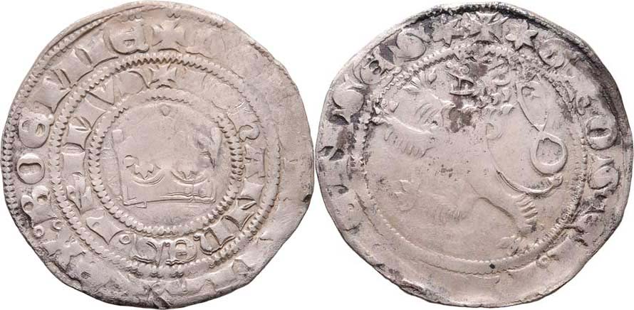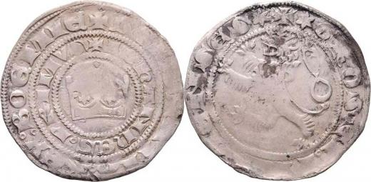 Pražský groš, Cn.1, bez rubní značky, 3.692g, nedor., nep.dvojráz, dr.hr., skvrny, patina