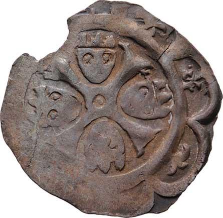 Fenik b.l., kříž, v úsečích čtyři korunované hlavy, Blätter für Münzfreunde 1910-str.4458, 0.734g, exc., nedor., vylomený okraj, pěkná patina RR!