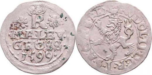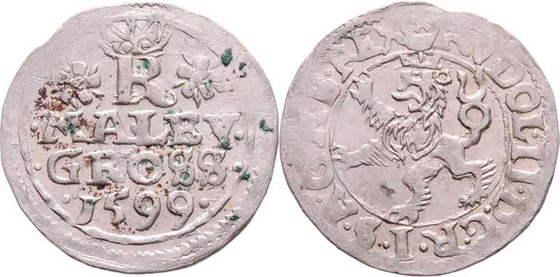 Malý groš 1599, Jáchymov-Hoffmann, HN.8b (opis 7c), nápis ". MALEY ./. GROSS ./. 1599 .", 0.914g, nedor., skvrnky