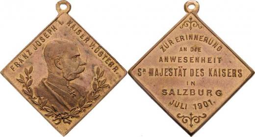 Nesign. - klipa na návštěvu v Salzburku - červen 1901 - hlava zprava, vavříny, opis / 7-řádkový něm.nápis, zlacený bronz 25x25 mm s původ. raženým ouškem, pat.