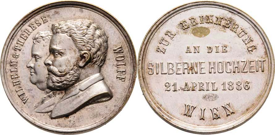 Nesign. - Wilhelm a Therese Wolff - stř.svatba 1886 - dvojportrét zleva, opis / 5-řádk. nápis, postříbřený bronz 30 mm, skvrnka
