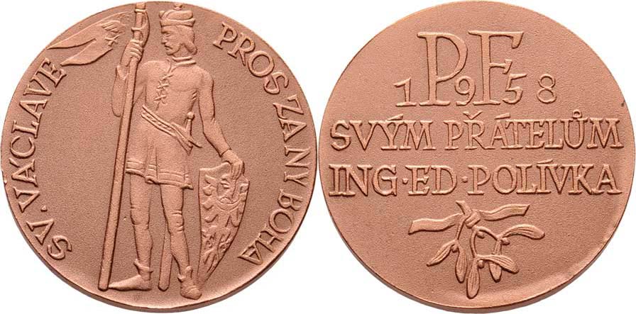 Nesign. (Špánek) - PF 1958 - stojící svatý Václav s praporcem, opis / 3-řádkový nápis a snítka jmelí, patinovaná měď 24mm, 8.098g R!