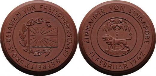 Německo 11.2.1942 - dobytí Singapuru Japonci - japonská vlajka, vavřínový věnec, opis / lev u palmy, opis, značený míšeňský hnědý porcelán 50 mm