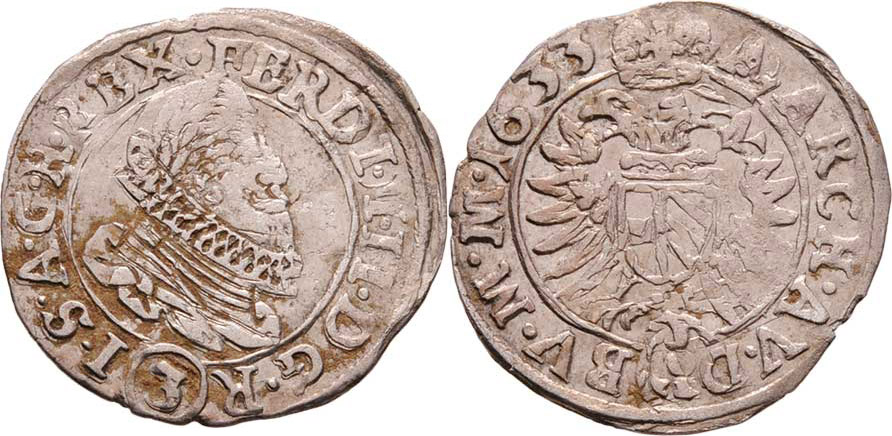 3 Krejcar 1633, Praha-Schuster, J.31, MKČ.763, 1.386g, nep.nedor., zajímavý dvojráz, pěkná patina