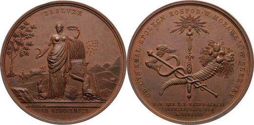 Hospodářská spol. pro Moravu a Slezsko b.l. - stojící Ceres se symboly úrody, nápis / žezla a roh hojnosti, písmo, Sign., bronz 62 mm, MZČ.119/2, dr.hr., patina