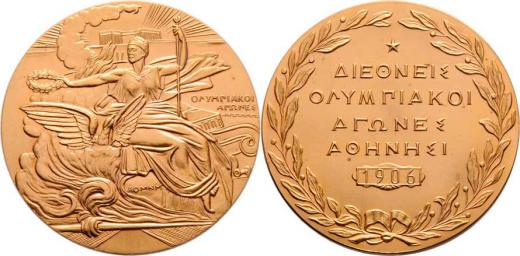 Atény 1906 (pozdější) - Meziolympijské hry - replika medaile za I.místo, Nesign., zlacený bronz 50 mm