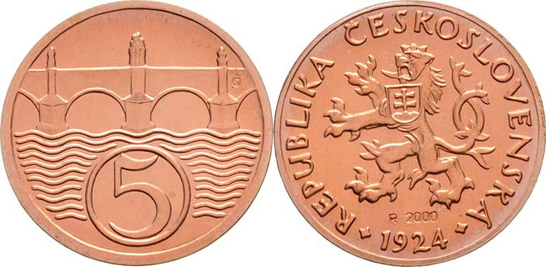 5 Haléř 1924 - replika - značená R 2000, Kremnica, 2.094g, kapsle, etue, certifikát (raženo 1000 ks) R!