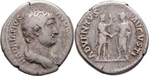 AR Denár, Rv:"ADVENTVS.AVGVSTI.", stoj. Roma a císař, S.neuvádí, RIC.226 - mincovna Řím - ražba z let 134 - 138, nepravidelný okraj, nep.nedor., patina