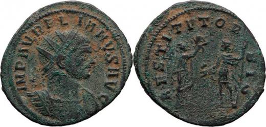 AE Antoninianus, Rv:"RESTITVT.ORBIS.", Victoria a císař, podobný S.3165, RIC.386 - mincovna Cyzicus - blíže nedatován, mírně exc., mírně nedor., patina