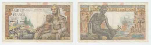 1000 Frank 8.7.1945, Pick.102, protržená cca 10mm, skvrny