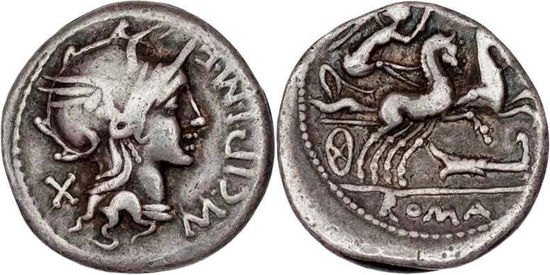 AR Denár, Hlava Romy zprava, opis "M.CIPI.M.F.X." / Victoria na bize, nápis "ROMA.", Crawford.289/1, Seaby.Cipia.1, Alb.1063, mírně exc., pěkná patina