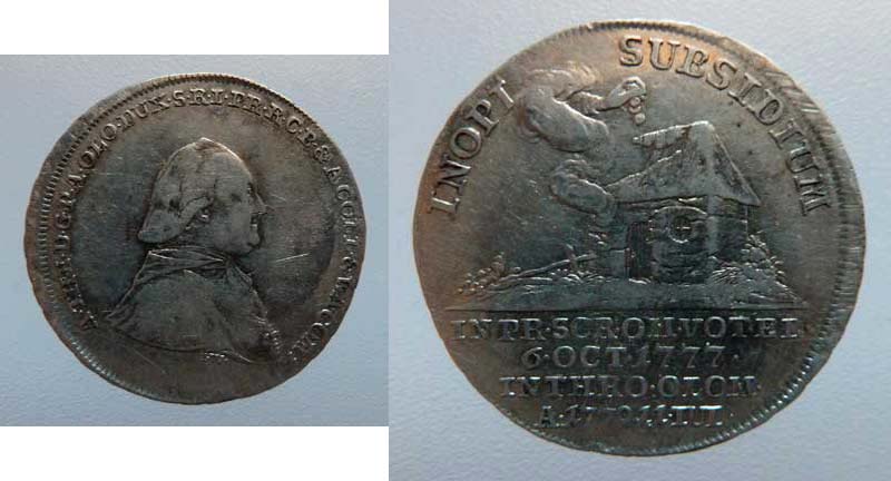Würt - menší intronizační jeton 1779 - poprsí zprava, opis / Boží ruka ochraňuje stavení, opis a 4-řádkový nápis, Sign., Ag 25mm, 3.947g, Taul.265, just., pat.