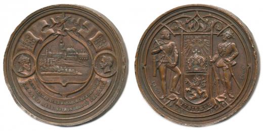 Praha - 500.výr.sboru měšť.ozbrojenců pražských, 1860 Dvě postavy, uprostřed znak s korunou / pohled na město v ozd.kartuši Sign.W.S, Litý bronz 45 mm, Do.4894, MZČ.32_čet.hry v rev.