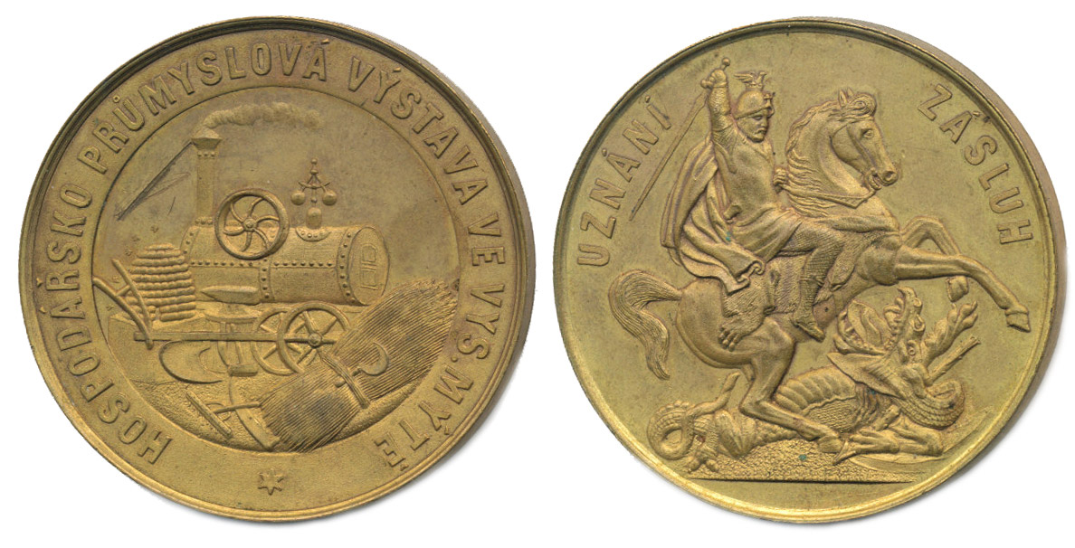 Nesign. - hospodářsko průmyslová výstava - uznání zásluh, b.l. Hospodářské a průmyslové atributy, opis / sv.Jiří zabíjí draka, opis Pozlac.bronz 48 mm, 39,05 g_tém.