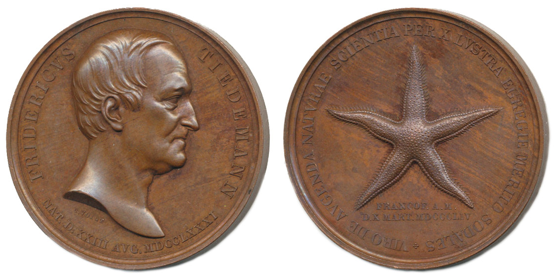 C.Voigt - F.Tiedemann (fyziolog a zoolog) - medaile k 50. jubileu udělení doktorátu 10.3.1854, poprsí zprava, latinský opis / mořská hvězdice, latinský opis, Sign., Bronz 44 mm, 40,14 g