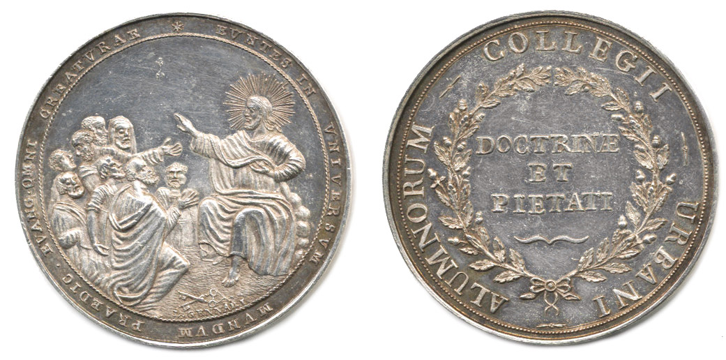L.Gennari - záslužná medaile pro žáky Urbanovy papežské univerzity pro výchovu misionářů b.l. (1808), Kristus rozesílá učedníky do světa, opis / 3řádk.nápis v dubovém věnci, opis, Sign., Ag 41 mm, 25,10 g _R! tém.
