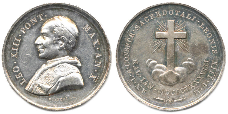 Nesign. - medaile k 50.výročí kněžského svěcení 1887 Poprsí papeže zleva, opis / zářící kříž vystupující z oblaků, dvojitý opis, Ag 31 mm, 9,74 g_tém.