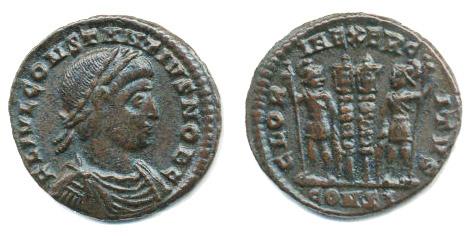 AE3/4, Rv:"GLORIA.EXERCITVS.", dva vojáci se 2 standartami S.3886, C.104, K.147.19