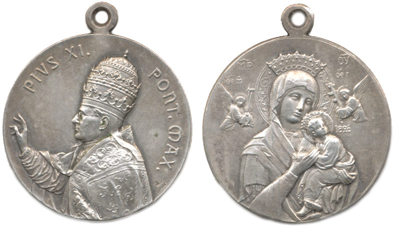 Medaile pontifikační 1922 Portrét žehnajícího papeže zleva, opis / Panna Marie Ustavičné pomoci, Byzantská ikona z kostela sv.Alfonse v Římě, Sign.monogram, Alpaka 32 mm, 14,11 g_orig.raž.ouško