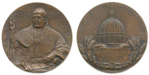E.Boninsegna - medaile na Svatý rok 1925 Žehnající papež v pluviálu pokládá na zeměkouli listinu / tabulka položená na svazcích obilí, za ní zářící kopule basiliky sv.Petra v Římě, opis, 1925, Sign.monogram, Cu 35 mm