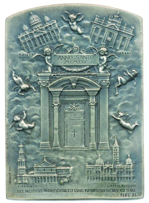 Jos.Stiastny - plaketa na Svatý rok 1925 Svatá brána, kolem sedm andílků, v rozích čtyři římské basiliky, 1řádk.nápis, Sign., Ag plaketa 53,5x75 mm, 96,15 g_jednostr.