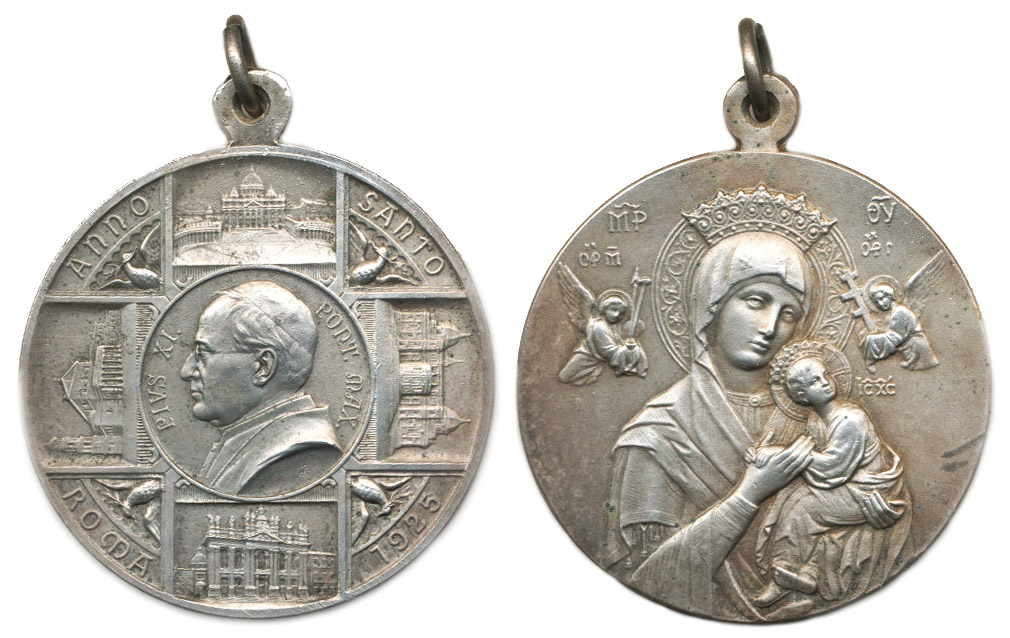 Medaile na Svatý rok 1925 Zářící široký kříž, na němž jsou čtyři římské basiliky, uprostřed poprsí papeže zleva, opis / obraz Matky ustavičné pomoci, opis Sign.HK, Alpaka 40 mm, 28,12 g_orig.raž.ouško