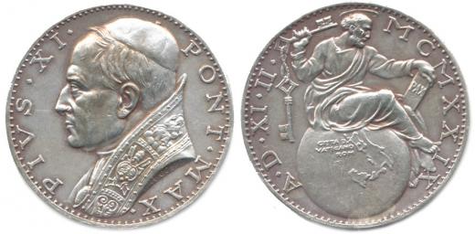 K.Goetz - medaile na uzavření Lateránské smlouvy (vznik státu Vatikán) Poprsí papeže zleva, opis / sv.Petr s klíči a tabulkou Pax sedící na zeměkouli, opis, 1929, Sign., Ag 36 mm, 19,90 g