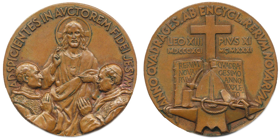 Mezzana - 40 let od vydání encykliky RERUM NOVARUM 1891-1931 Kristus žehná klečícím, opis / pracovní nástroje před otevřenou biblí Sign., Bronz 37 mm