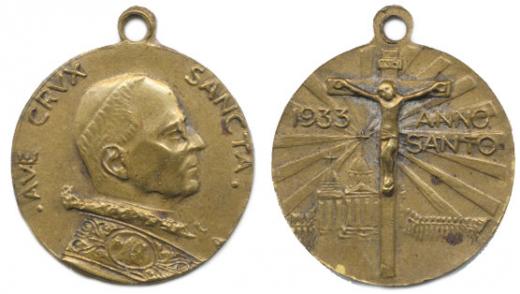 Nesign. - medaile na Svatý rok 1933 Poprsí papeže zprava, opis / Kristus na kříži, v pozadí chrám sv. Petra se zástupy poutníků, Mosaz 22 mm_orig.raž.ouško