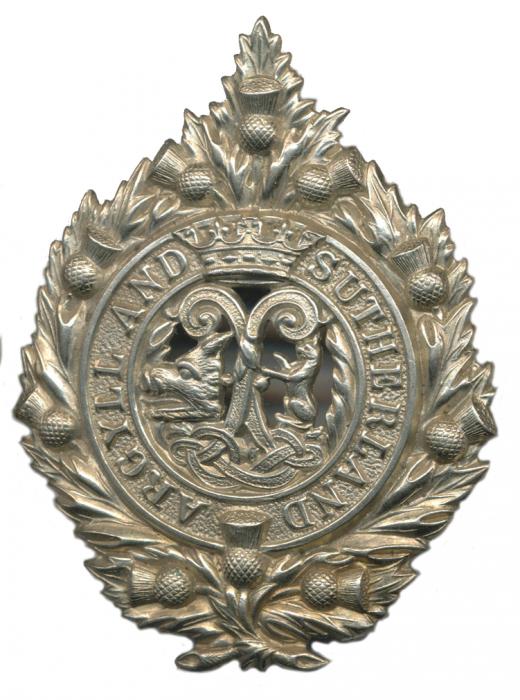 Čepic.odznak na baret - Argyll and Sutherland Highlanders - Pluk skotských horalů z Argyll a Sutherland, hlava divočáka a stojící šelma zleva, korunovaný opis ve věnci z bodláků a listů Bílý dutý plech 59x80 mm_2 očka k uchycení