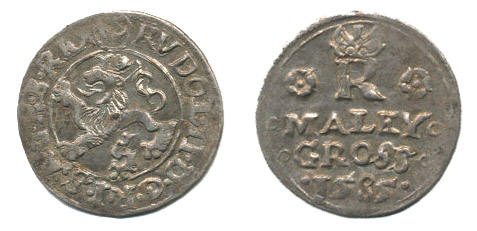 Malý groš 1585, Jáchymov-Hoffmann, HN.7a (opis 7c), jako Ja.4c varianta nápisu: "o MALEY o/o GROSS o/. 1585 ."_R!
