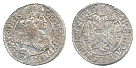 3 Krejcar 1667, Vratislav-Hammerschmidt, Nech.737, MKČ.1619, Her.1536, opis končí ...SIL:_tém.
