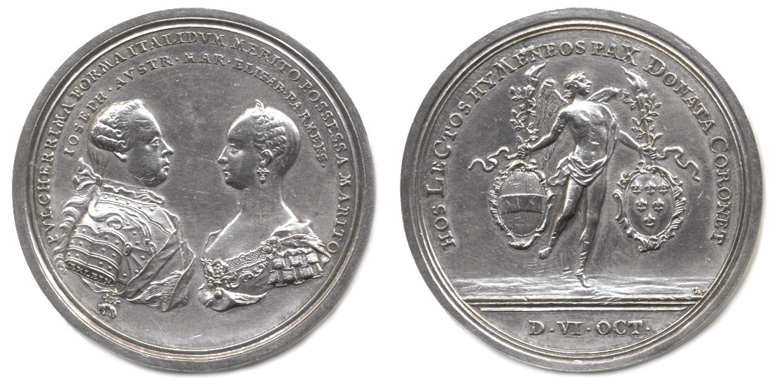 Oexlein - medaile na uzavření sňatku Josefa II. s Alžbětou Parmskou Dvojportrét proti sobě, dvojitý opis / anděl se dvěma pochodněmi a dvěma štíty 1760, Ag 44 mm, 29,02 g, Mo.-, LG.XIV/157_R! tém.