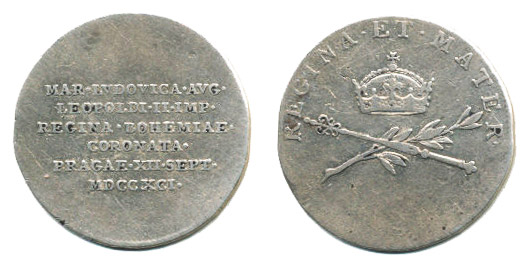 Menší peníz na korunovaci v Praze, 12.IX.1791 Koruna, žezlo, vavřín.snítka a opis / 6řádk.nápis, Nesign., Ag 20 mm, 2.15 g, ČS.1434, Mo.2247, Nov.XVI/R-3b