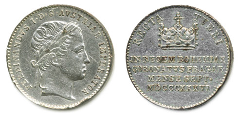 Menší peníz na korunovaci v Praze, 7.IX.1836 Portrét, opis / koruna, nápis, opis, Nesign. Ag 18 mm, 3.29 g, ČS.1494, P.3/24, M.2565, Nov.XVIII/D-4b