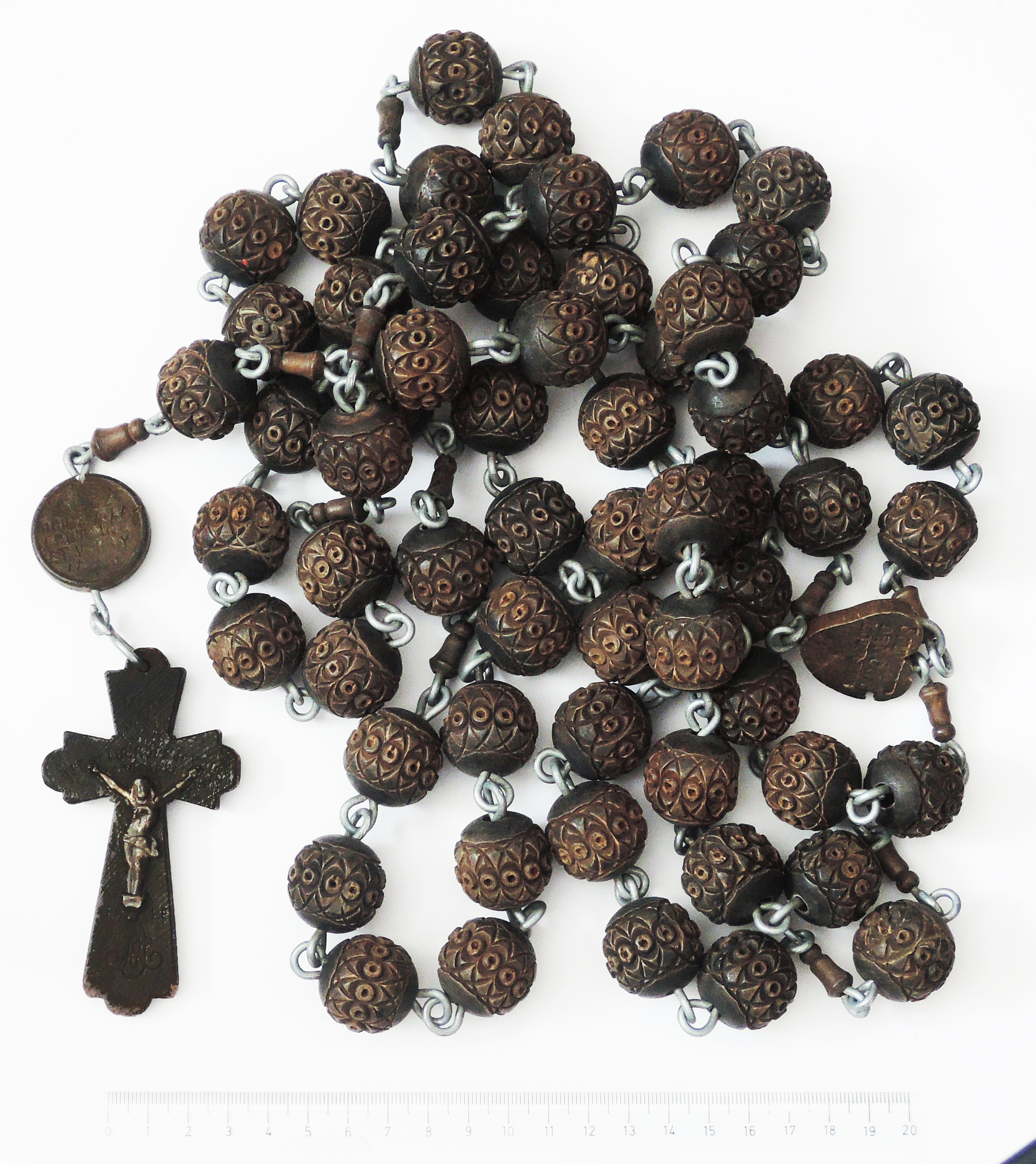 Lurdy - poutní upomínkový růženec, vyřezávaný z tmavého dřeva, s raženými lurdskými texty a výjevy na křížku na na spojkách celková délka 270 cm, kuličky průměr 23 mm