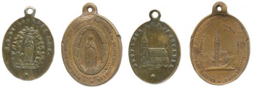 Poutní medailka z 2.pol. 19.stol., bazilika v Lurdách / stojící Panna Maria, Mosaz 18x22 mm, 20x25 mm_orig.raž.ouško 2 ks